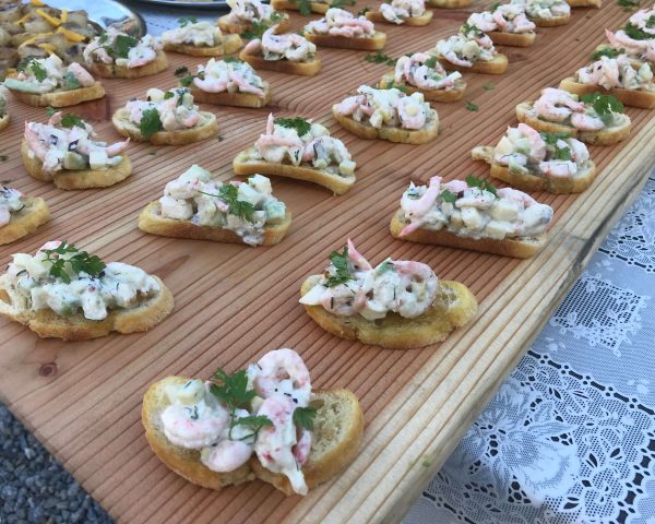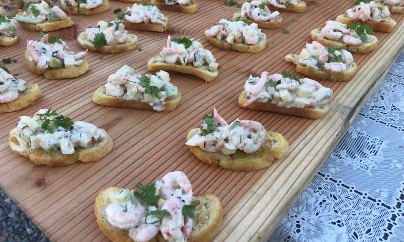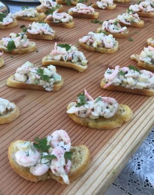 En pavillon med fisk og skaldyr. Rejer med frugmix og sprød rug og rørt varmrøget laks serveret på sprøde toast