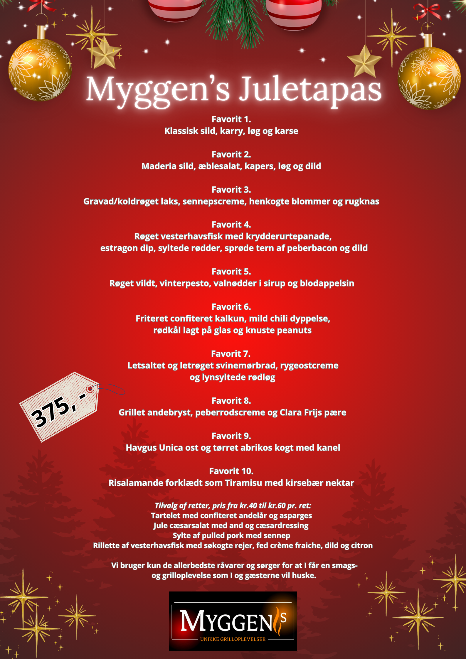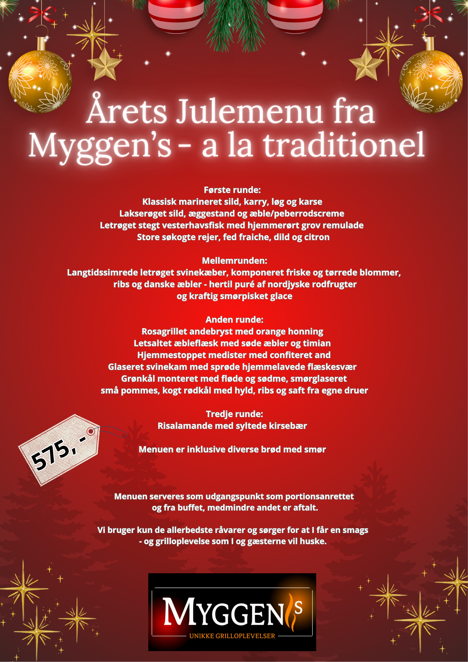 Vores julefrokoster er ikke kun fyldt med traditionel julemad – vores dygtige grillkokke kan også tilføje en unik touch til menuen med deres fantastiske grillretter. Der er intet som saftige, grillet kød og grøntsager til at tilføje lidt ekstra festligheder til julefrokosten. Vi kan tilbyde et bredt udvalg af grillretter, fra lækre bøffer til sprøde grøntsager og krydrede pølser.