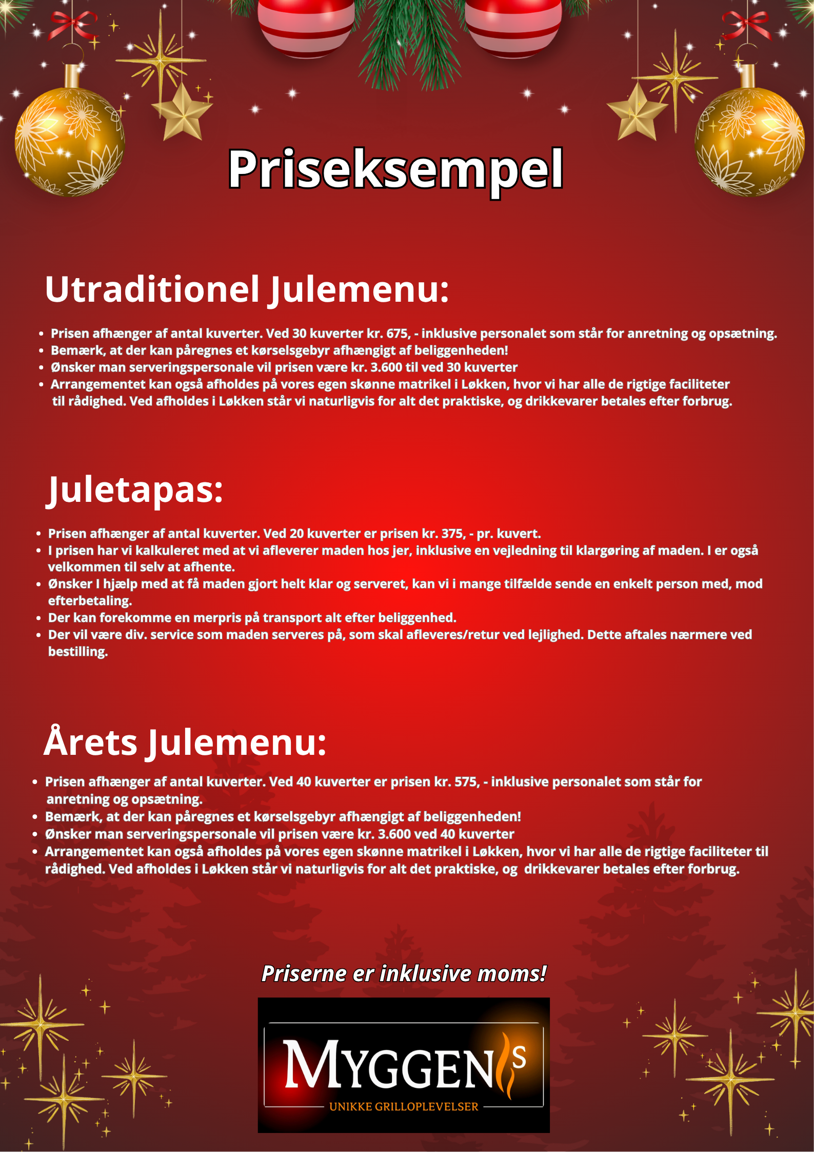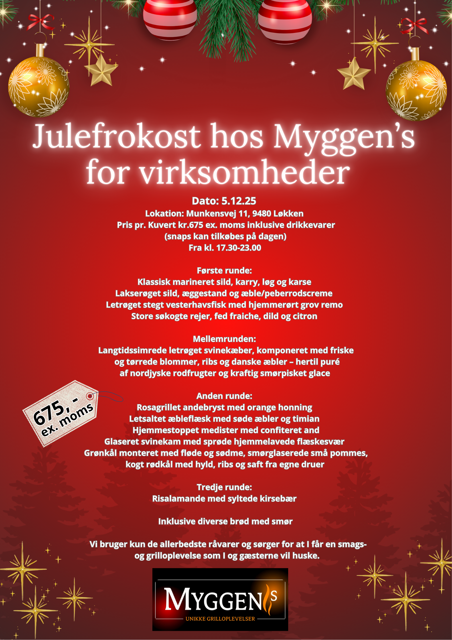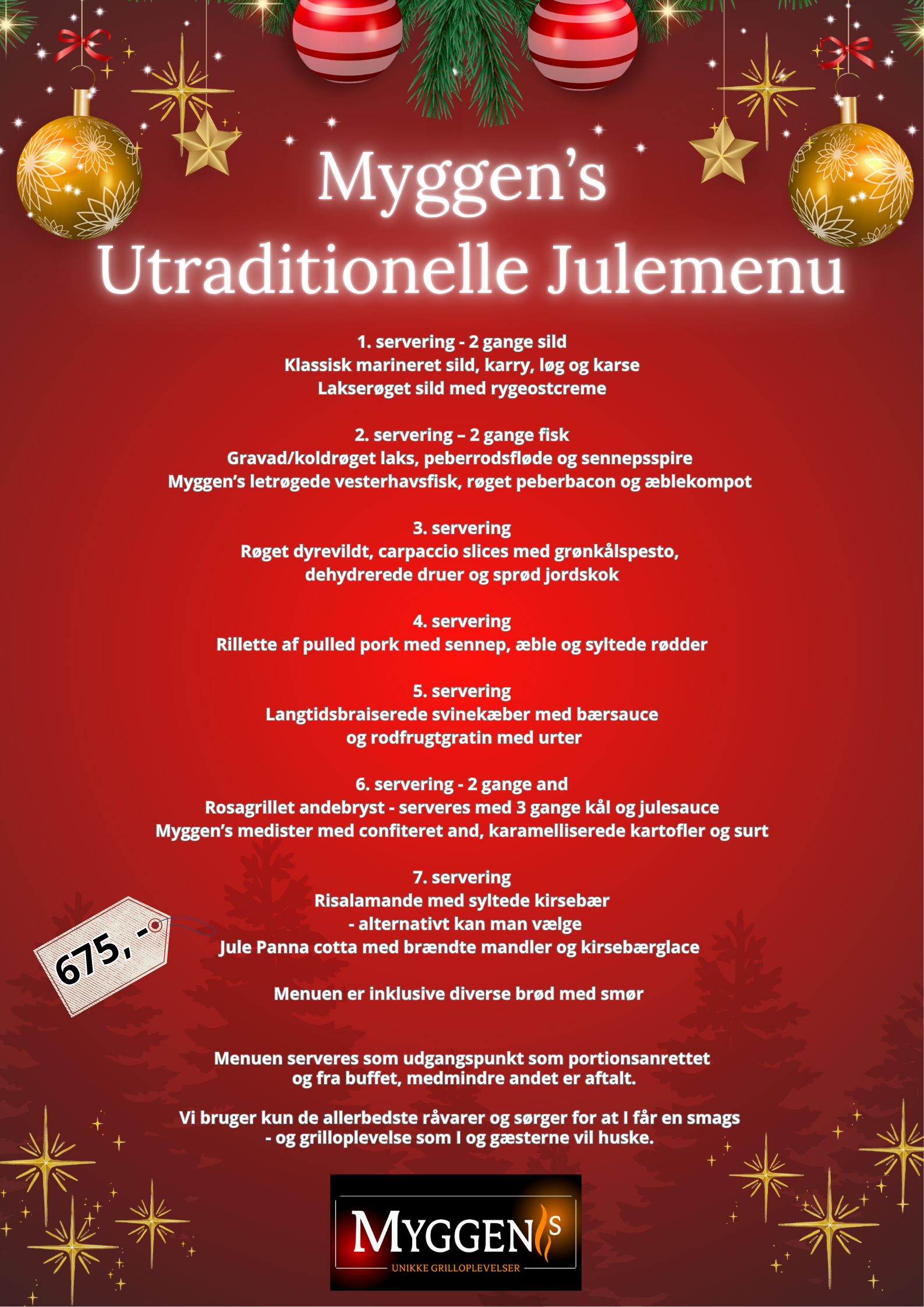 Vores julefrokoster er skræddersyet til at skabe en uforglemmelig oplevelse for dig og dine gæster. Vores erfarne team vil sørge for, at din julefrokost bliver en succes, og vi kan tilbyde forskellige pakker og menuer, der passer til enhver smag og budget. Vores menuer spænder fra traditionelle juleretter til moderne og kreative retter, der vil imponere selv de mest kræsne gæster dog er vores grill altid i spil.
